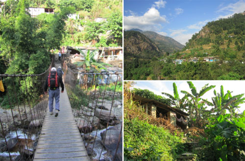 • Descended the depths of the river valley to Jhinu (1780m). We did not partake in the hot springs nearby. Instead, Dhana, continued to point out the extensive diversity of vegetation along the way. He showed us, and we sometimes sampled, wild cucumbers, wild asparagus, cinnamon, tumeric, passion fruit, wild black pepper, alderberry, walnut, fiddle head ferns and the bulbs located on their roots, yams, poinsettas trees (and I thought they only came potted), mimosa plant, fig trees, lemon trees, orange trees, string beans, lettuce, cabbage, buckwheat, millet, sugar cane, soy beans, carrots, yarrow, wild strawberries, and marijuana. I’ll leave it to the reader to guess which of these plants I collected for later consumption.